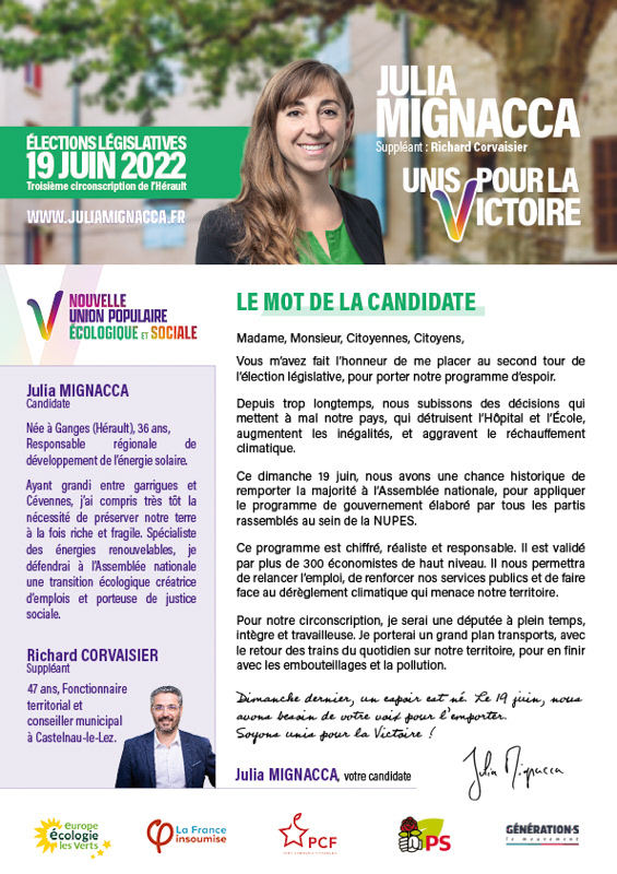Campagne graphique de la candidate Julia Mignacca (3e circonscription de l'Hérault) pour les élections législatives 2022 - Création des documents officiels affiches et professions de foi pour la Nouvelle Union Populaire et Sociale (NUPES).